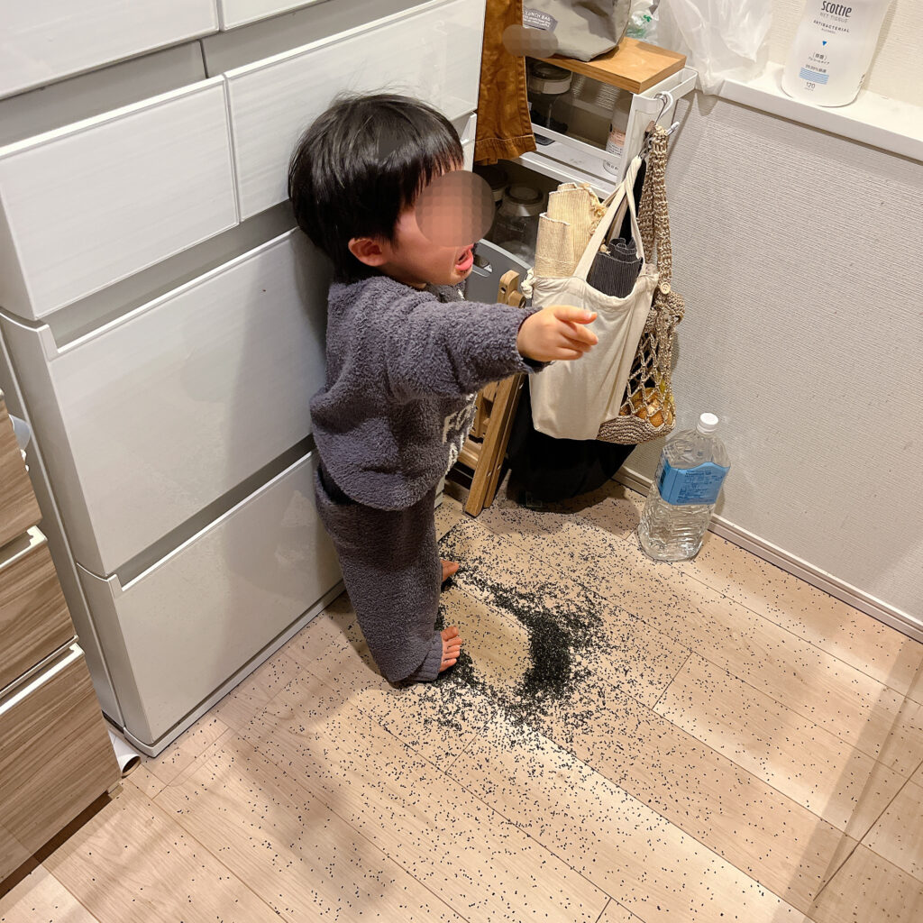 胡麻が入っているケースを特に気に入っているようで、ぶちまけられるのは胡麻が多いのですが、ぶちまけた後に足にくっつくのが不快なようで大泣きしています。
