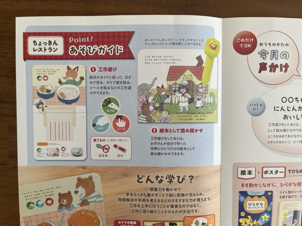 こちらは、ハサミ(別途用意)と4月号またはクリスマス特大号で届く「おしゃべりしまじろうペン」を使用する教材です。