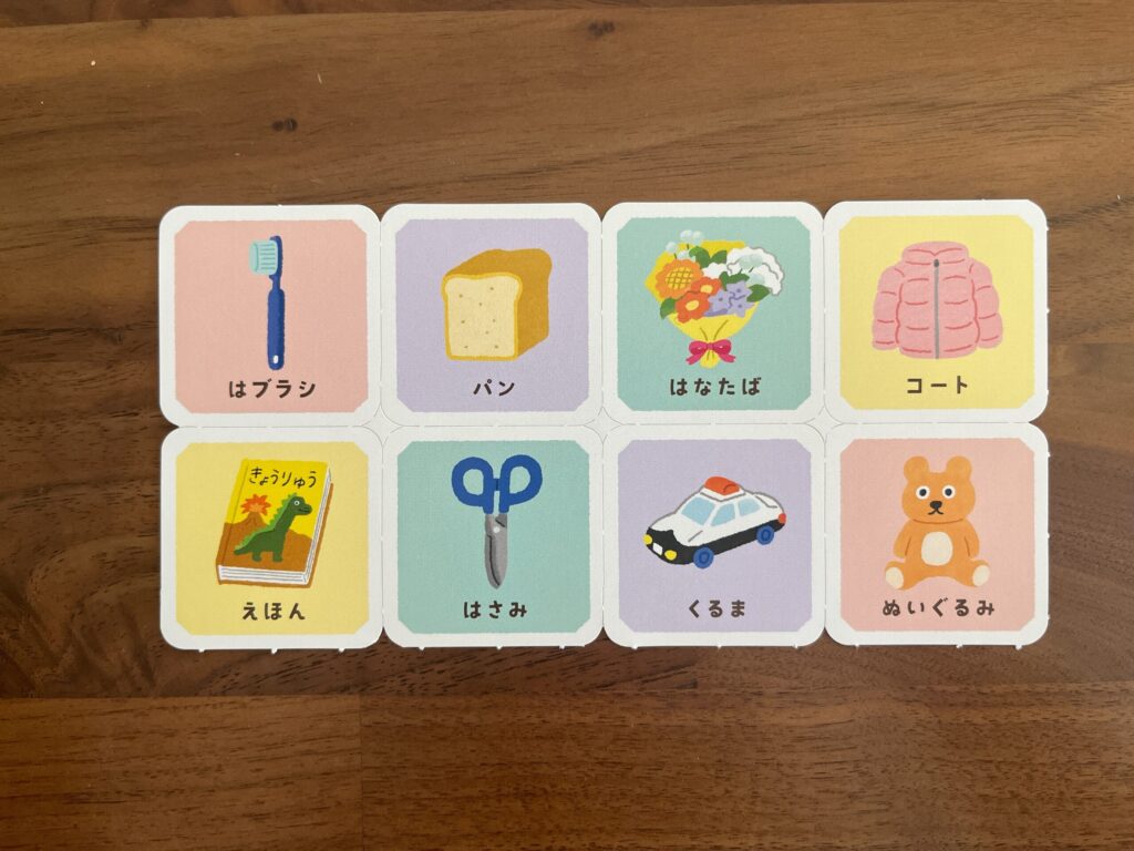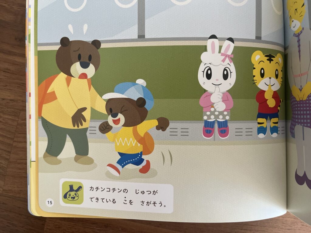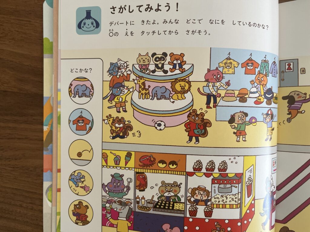 絵が細かく、まだ多くの単語や絵を理解していない息子にとっては難しい内容だったので、「○○はコレだね!」「○○の近くにあるね!」など、ヒントを出しながら一緒に取り組みました。