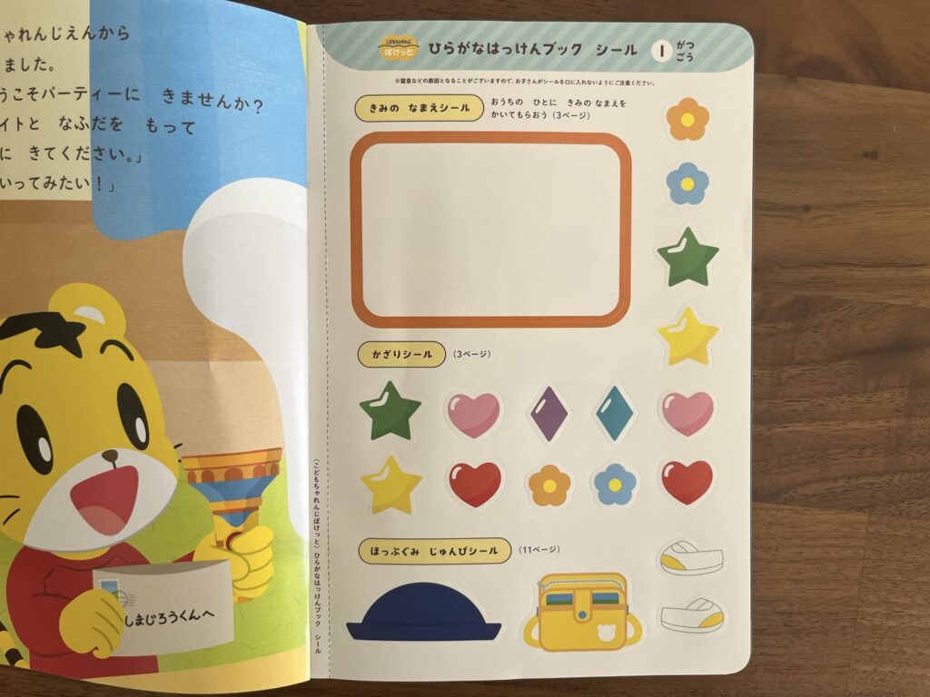 ひらがなはっけんブックは「ちゃれんじ園のほっぷ組からようこそパーティーのお誘いを受けたしまじろう」と一緒に課題を進めていく内容でした。