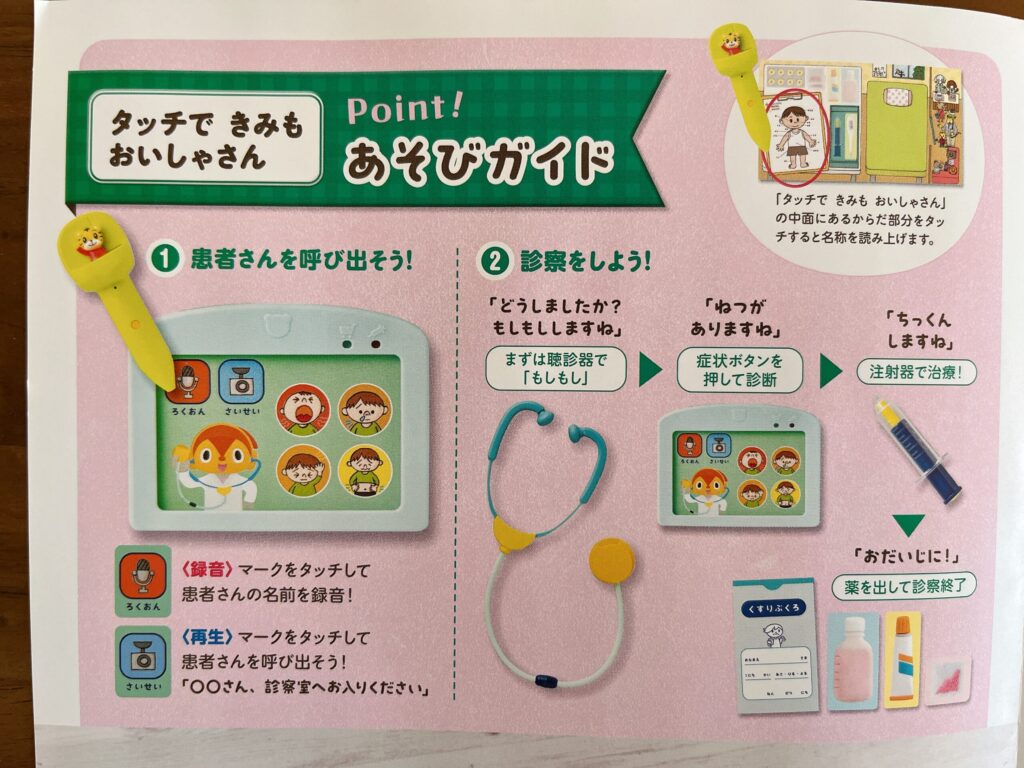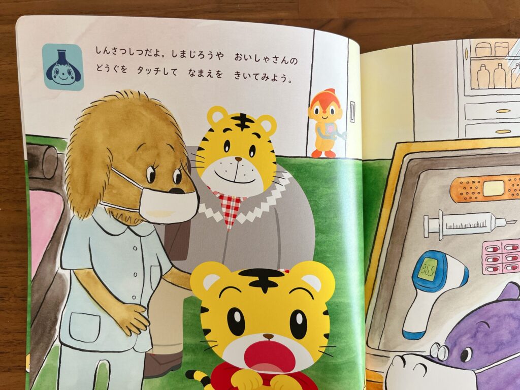 こちらは、4月号またはクリスマス特大号で届く「おしゃべりしまじろうペン」と「レジフレーム」を使用することで、まるで本当に診察しているかのような本格的なごっこ遊びをすることができます!