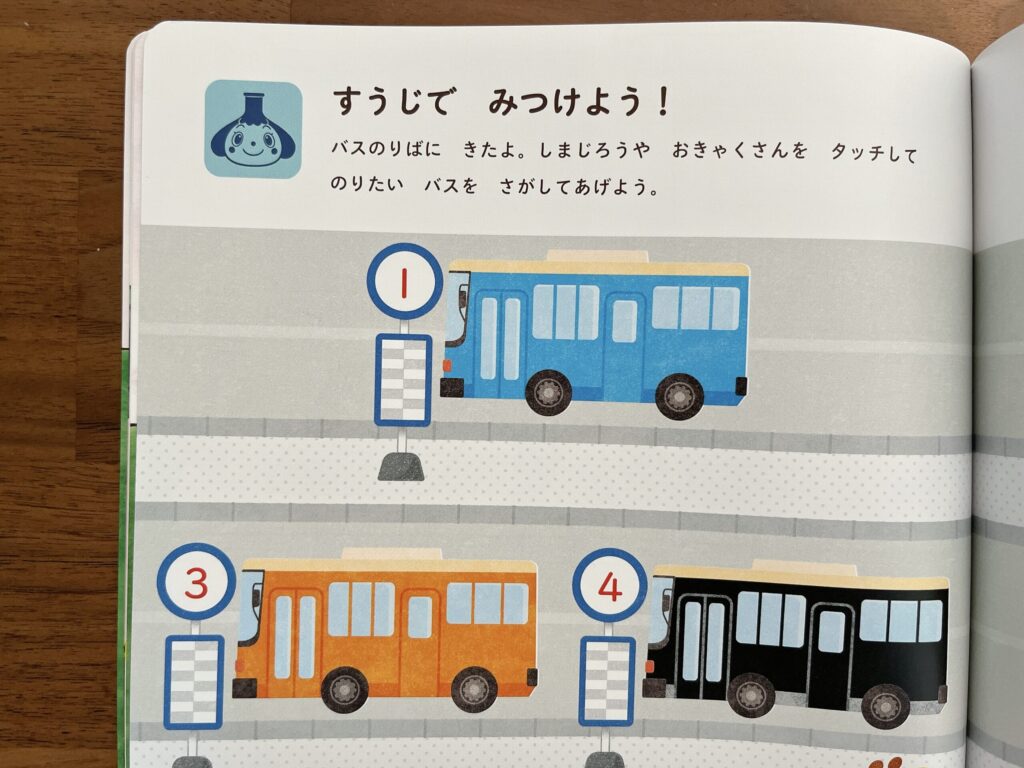 数詞では、しまじろうやお客さんの乗りたいバス停の数字を聞いて数字の読みを学びながら探すことをねらいとしています。
