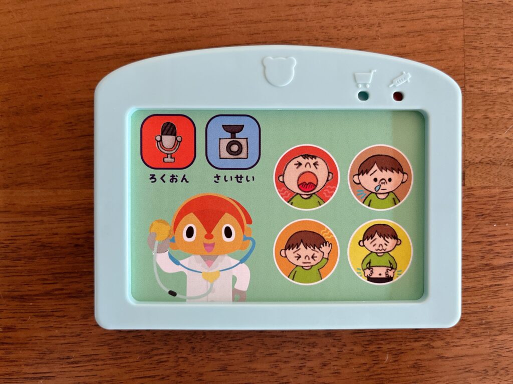 聴診器で「もしもし」と診察したあとは、ディスプレイボードの症状ボタン(「鼻水ですね」「風邪ですね」など)を押して診断し、注射器で治療やお薬の処方まで、本当のお医者さんになりきることができます。