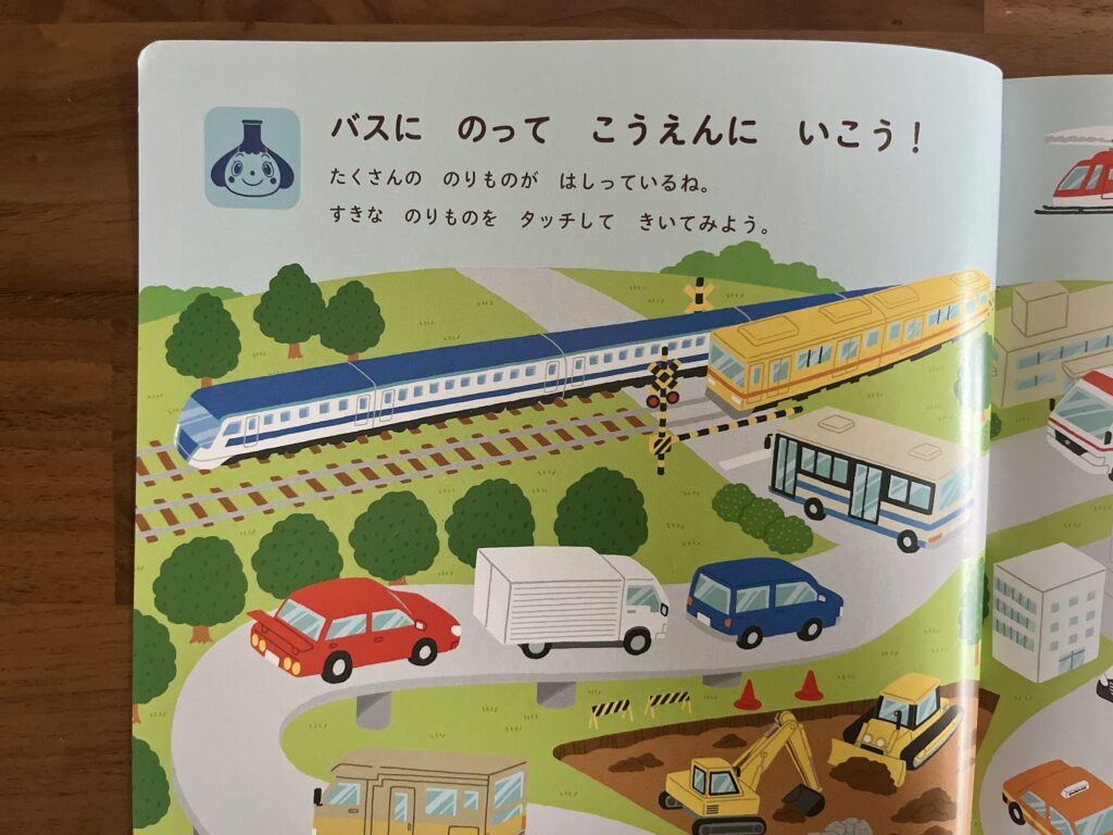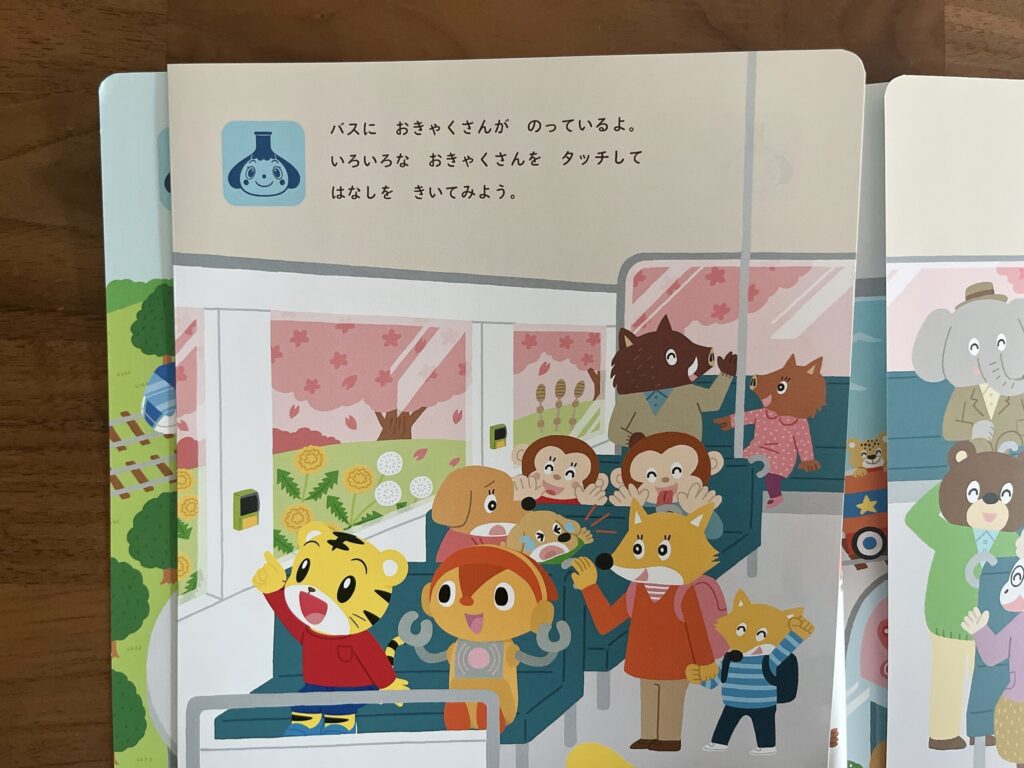 バスに乗って公園に向かう道のりで、息子は「おしゃべりしまじろうペン」を片手に大忙し!