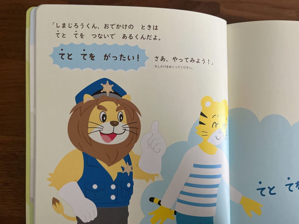 - しかけ絵本で、道路を歩く時のお約束(手を繋いで歩く、左右の確認)を体で覚えます。