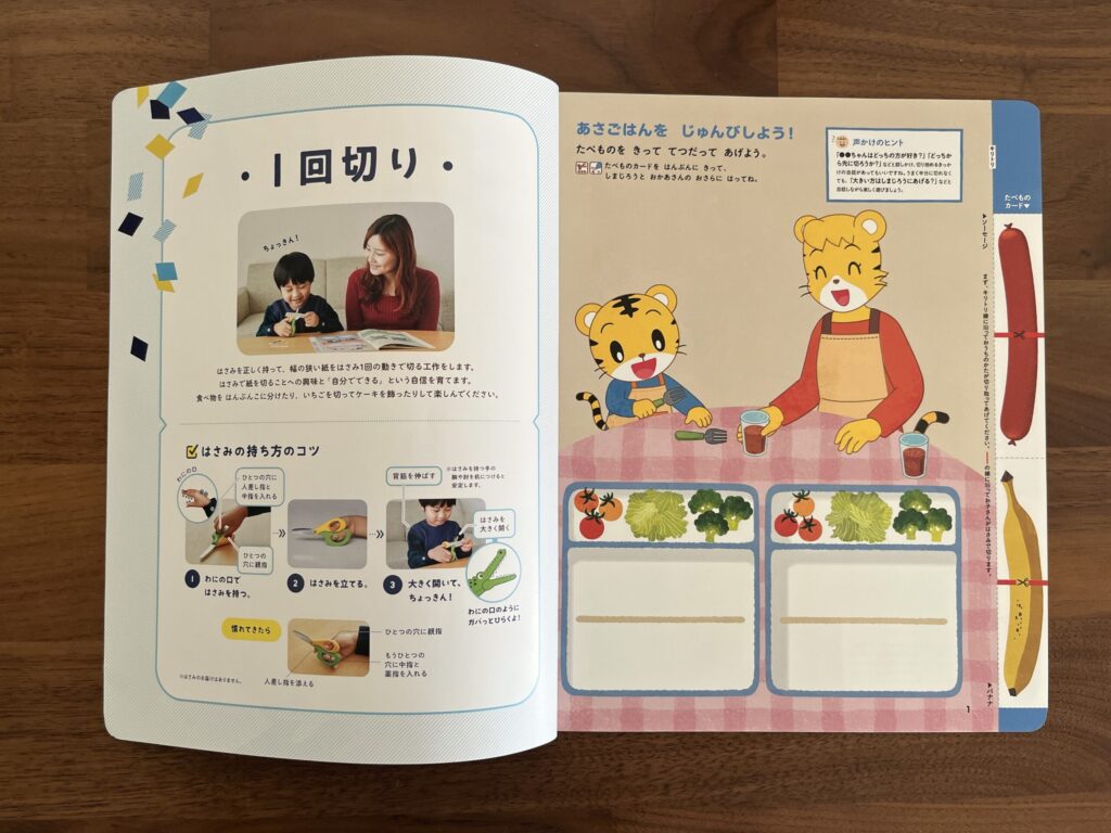 息子はまだハサミデビューしていませんが、時期を見て「はじめてのちょっきんブック」でデビューしようと思います。