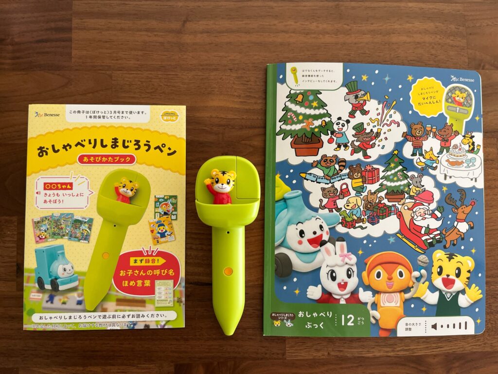 こどもちゃれんじの音声ラーニングペン「おしゃべりしまじろう」は、知育教材のエデュトイや毎号届く「おしゃべりブック」と連動して遊びを広げるためのペンです。