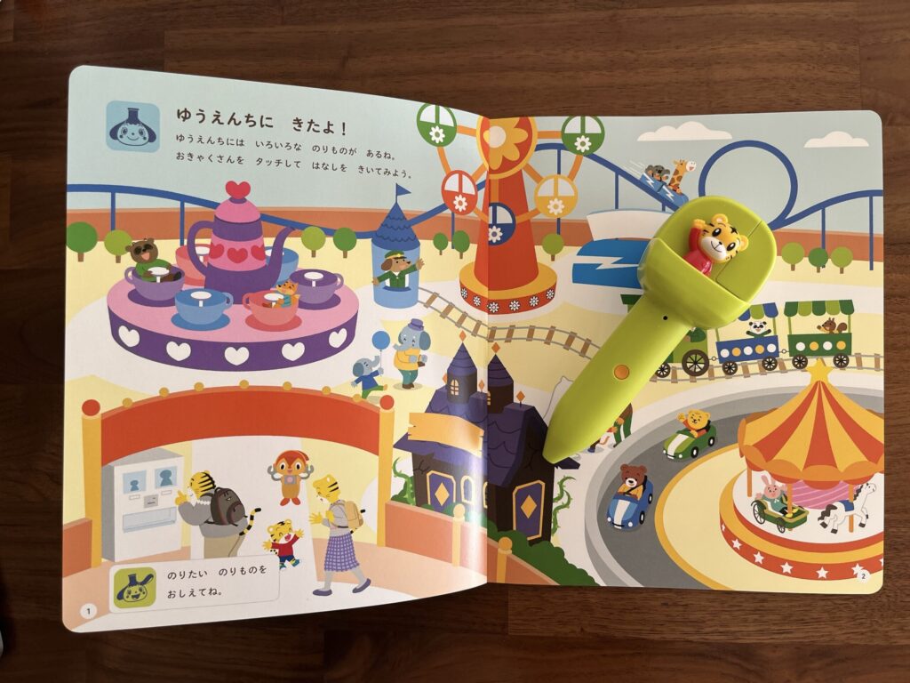 教材にペンをタッチすることで、しまじろうたちの音声が流れたり、歌が流れたりします。