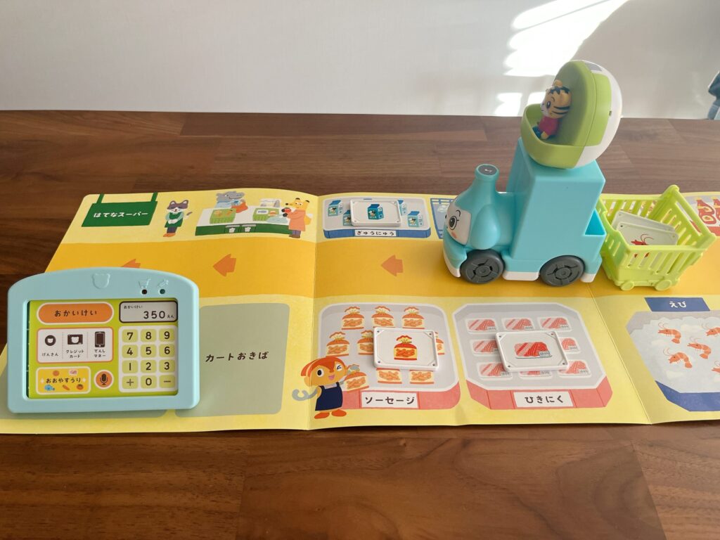 息子が一番気に入って遊んだのは、メインエデュトイの「おしゃべりスーパーマーケット」でした。